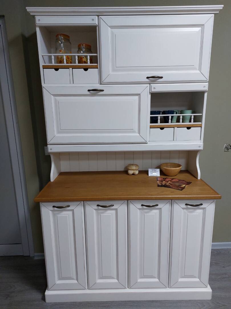 ⇒Врати,цокъл и корниз: Масив Бук ⇒Цвят: Бяла боя (състарена с прожулване ) ⇒Корпус: МДФ ; ЛПДЧ ⇒Плот: МДФ е естествен фурнир Дъб ⇒Панти: Blum